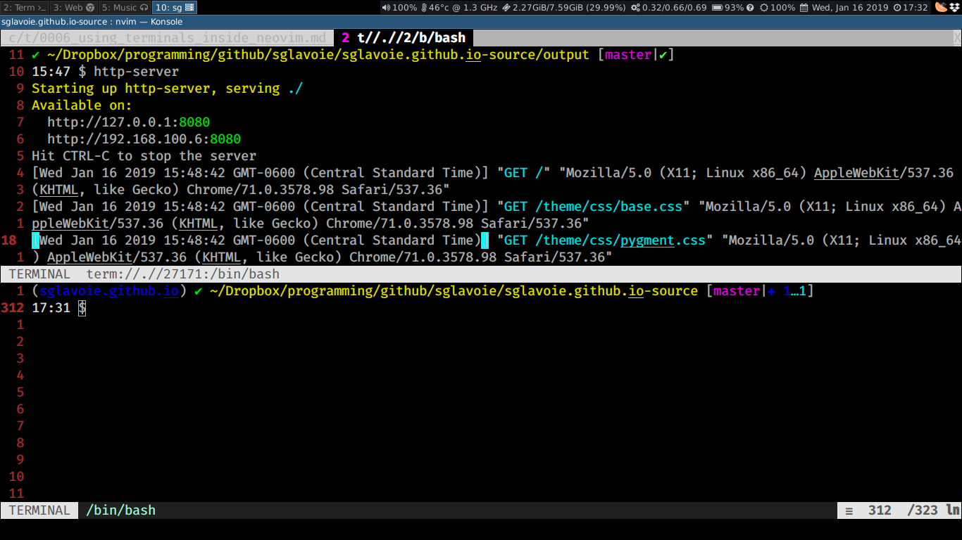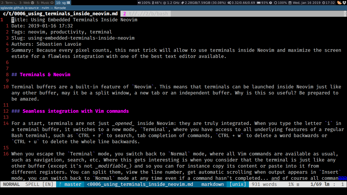 Because the terminals are running with one Neovim instance, you get everything in the same place, which is usually how you need to access your work anyway. If for some reasons you need to have multiple instances of Neovim running, this is possible too and in that situation you could simply split them into different workspaces.