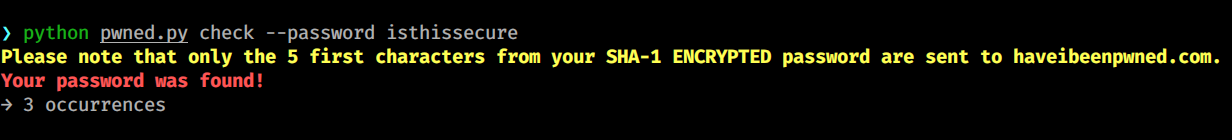 click.secho('python3 pwned.py check --password MyPasswordHere', fg='green')
