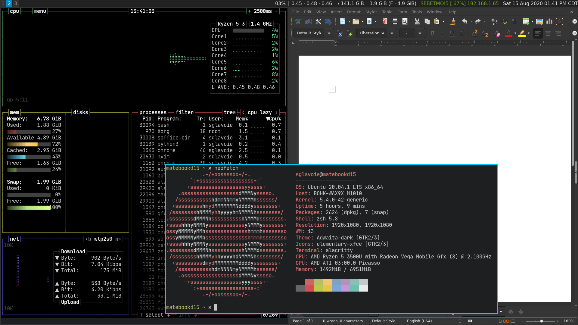 Of interest in this section, apart from the actual colors, is where you will set your i3bar on the screen (top vs bottom) and on which monitor your tray (the space with little icons to show the volume, WiFi connectivity and so on) will be displayed if you have more than one monitor. In this case, the bar displays at the top of the screen à la Mac or à la GNOME with position top and reveals information about system resources with i3blocks (you can find how it can be configured in my dotfiles or in the i3blocks GitHub repo).